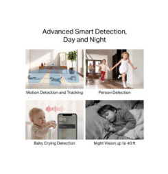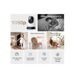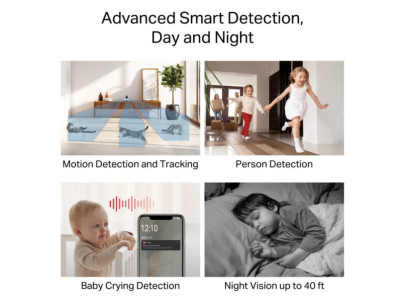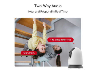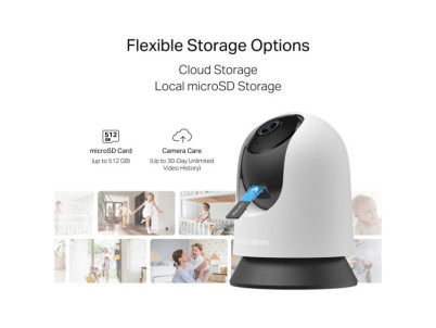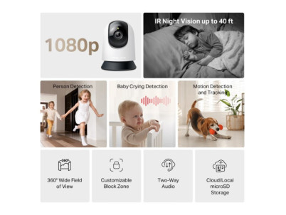 MC200 Pan/Tilt Wi-Fi Bezpečnostná Kamera - 1080p HD video s 360° horizontálnym otáčaním pre kompletné pokrytie. Inteligentná AI detekcia pohybu, osôb a plaču dieťaťa. Nočné videnie až 12m. Obojsmerné audio pre komunikáciu. Podporuje microSD karty až 512GB a cloudové úložisko MERCUSYS. Wi-Fi pripojenie s kompatibilitou Google Assistant a Amazon Alexa. Prispôsobiteľné blokovacie zóny. Stolové alebo stropné umiestnenie. Obsahuje adaptér a montážne príslušenstvo.