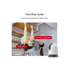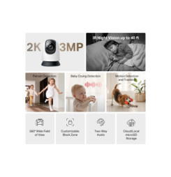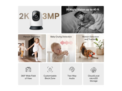 MERCUSYS MC210 - pokročilá Wi-Fi bezpečnostná kamera s 2K 3MP rozlíšením a 360° horizontálnym otáčaním pre kompletné pokrytie priestoru. Disponuje inteligentnou detekciou pohybu, osôb a plaču dieťaťa s okamžitými upozorneniami. Nočné videnie dosahuje až 12 m, obojsmerné audio umožňuje komunikáciu v reálnom čase. Podporuje microSD karty až 512 GB a cloudové úložisko. Kompatibilná s Google Assistant a Amazon Alexa. Ideálna pre domáce monitorovanie s diaľkovým ovládaním cez mobilnú aplikáciu.