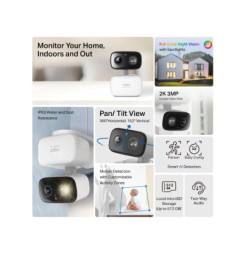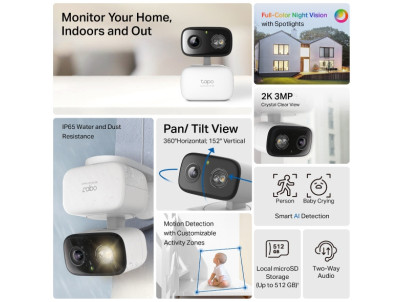 TP-Link Tapo C216 je pokročilá Wi-Fi bezpečnostná kamera pre interiér a exteriér, ktorá poskytuje rozlíšenie 2304 × 1296 px (2K) s farebným nočným videním. Vyznačuje sa 360° horizontálnym a 152° vertikálnym pohybom, automatickým sledovaním pohybu, a detekciou osôb a plaču detí. Zariadenie ponúka obojsmerný audio prenos, zvukový a svetelný alarm, a možnosť uloženia dát na microSD kartu až do 512 GB alebo do cloudových služieb Tapo Care. S IP65 ochranou a pripojením cez Wi-Fi (2.4 GHz) je ideálnym