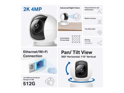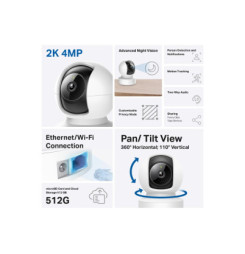 Tapo C222: Bezpečnostná IP kamera s 2K QHD rozlíšením (2560 × 1440 px), 1/3" CMOS snímačom. Horizontálny rozsah 340°, vertikálny 69°. Nočné videnie 850 nm IR LED do 12 m. AI detekcia: pohyb, osoby, vozidlá, zvieratá. Úložisko microSD až 512 GB, podpora Cloud. Sieťové pripojenie: Wi-Fi 2,4 GHz, Ethernet. Obojsmerný audio prenos, 99 dB alarm. Šifrovanie 128-bit AES, kompatibilita s Google Assistant/Alexa. Prevádzkový rozsah 0-40°C. Kompletné portfólio produktov TP-Link TAPO nájdete TU