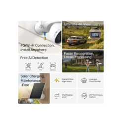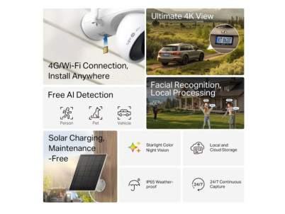 Tapo C665G KIT New: Bezpečnostná kamera s 4G LTE/Wi-Fi a solárnym napájaním pre flexibilné monitorovanie kdekoľvek. 4K rozlíšenie (8MP) a 18x digitálny zoom zabezpečujú ostrý obraz. Kamera inteligentne detekuje osoby, zvieratá a vozidlá, minimalizuje falošné poplachy. Ponúka 360° sledovanie s AI a farebné nočné videnie pre detailné zábery aj v tme. Inštalácia je jednoduchá, bez obmedzení napájania alebo Wi-Fi - ideálne pre odľahlé lokality ako farmy, kempy a stavby. Solárne napájanie zaručuje be