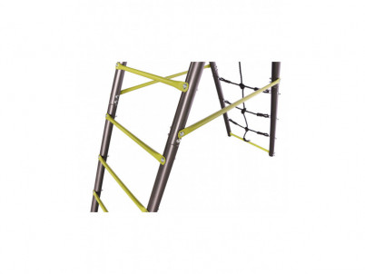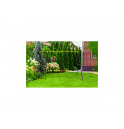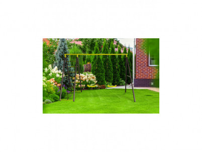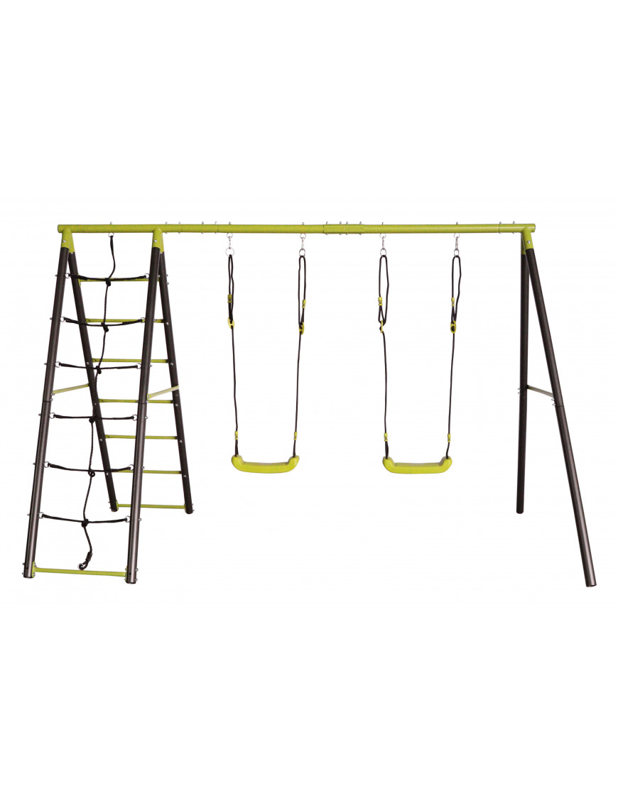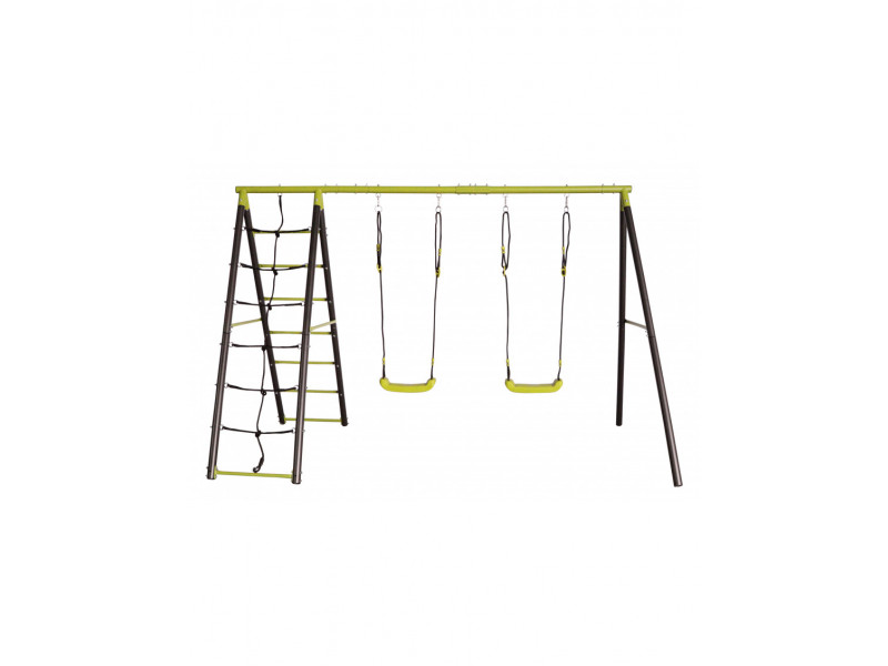 Záhradná hojdačka pre deti. Odolná a stabilná kovová konštrukcia s rebríkom a lezeckou sieťou, dve hojdacie sedačky s pevnými lanami na zavesenie. Vhodné pre dve deti od 3 do 10 rokov.