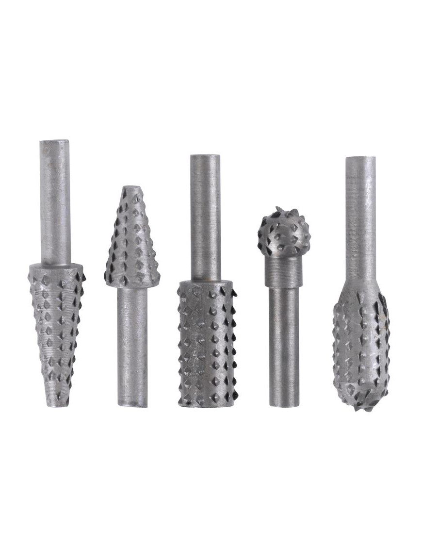 Sada rotačných rašplí by nemala chýbať vo vašej dielni. Sada pozostáva z 5 rašplí so stopkou s priemerom 6 mm a je určená do vŕtačky. Je ideálna na hrubšie obrusovanie a brúsenie dreva, drevotriesky a preglejky.