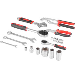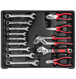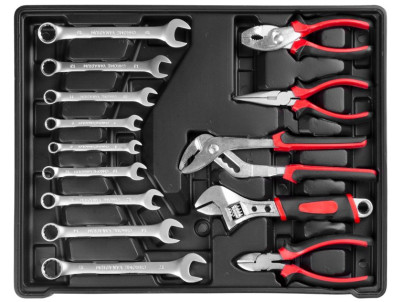 1 ks kliešte na poistné krúžky 150 mm • 1 ks kombinované kliešte 150 mm • 9 ks očkoplochý klúč 8-17 mm •