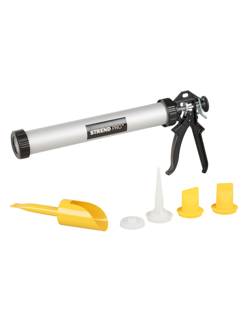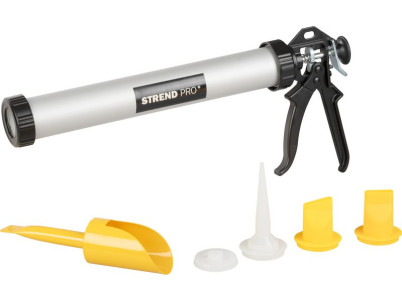 Sada Strend Pro obsahuje profesionálnu výtlačnú pištoľ a praktické nástavce, ktoré umožňujú jednoduchú a presnú aplikáciu tmelov, silikónov či lepidiel. Pištoľ je určená pre 600 ml náplne a vďaka kvalitnému spracovaniu zaisťuje spoľahlivú a pohodlnú prácu aj pri dlhodobom používaní.