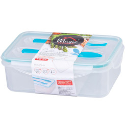 Plastový obedár MagicHome je určený na prenášanie potravín a jedál. Obsahuje vidličku a lyžicu a praktické 2 priehradky vo vnútri misky, pomocou ktorých si jednoducho oddelíte pokrmy. Obedár má 1,5 litrový objem. Plastový obedár môžete umývať v umývačke riadu, odkladať v chladničke i mrazničke.
