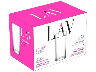 Sada obsahuje 6 kusov pohárov Liberty s rozmermi 62x133 mm a objemom 295 ml. Poháre sú jednoduchého a vysokého tvaru, slúžia na podávanie vody alebo rôznych nealkoholických nápojov či drinkov.