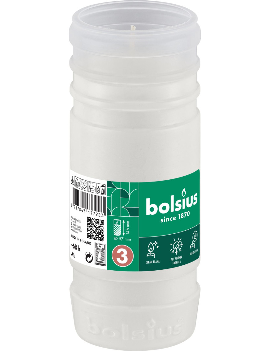 Klasická biela parafínová náplň Bolsius. Vyhorí až do konca, horí krásnym rovnomerným plameňom aj pri vysokej vlhkosti, veternom počasí alebo mraze. Nedymí, nefarbí a neničí lampáše. Nádobka na kartuše vyrobená z kvalitného svetlo prepúšťajúceho materiálu umožňuje jej stabilné umiestnenie v lampáši a zabraňuje vytekaniu vosku. Doba horenia – 68 hodín. Paletové množstvo: 2860 ks. Balenie obsahuje 20 ks.
