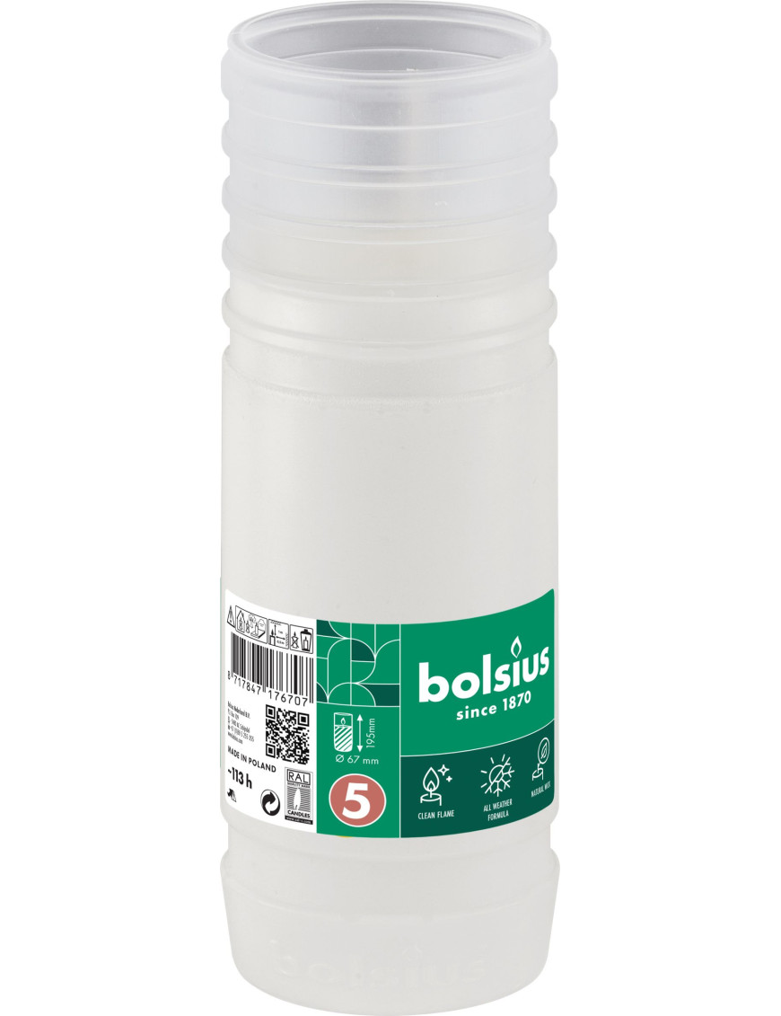 Klasická biela parafínová náplň Bolsius. Vyhorí až do konca, horí krásnym rovnomerným plameňom aj pri vysokej vlhkosti, veternom počasí alebo mraze. Nedymí, nefarbí a neničí lampáše. Nádobka na kartuše vyrobená z kvalitného svetlo prepúšťajúceho materiálu umožňuje jej stabilné umiestnenie v lampáši a zabraňuje vytekaniu vosku. Doba horenia – 113 hodín. Paletové množstvo: 1440 ks. Balenie obsahuje 15 ks.