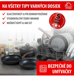 Ak si potrpíte na kvalitné kuchynské riady, táto panvica je pre Vás ako stvorená. Panvica MagicHome Black Marble Line je vyrobená zo zliatiny hliníka s nepriľnavým povrchom a 3-vrstvovým mramorovým náterom. Má 3 mm indukčné dno, ktoré šetrí energiu. Rukoväť obsahuje drevený náter s ochranou proti plameňu. Panvica je vhodná na všetky typy sporákov : indukcia, elektrika, plyn, sklokeramika a halogén a je tiež vhodná do umývačky riadu. Nevhodná do rúry. Je šetrná k životnému prostrediu, neobsahuje PFOA, PFOS, VOC, PB ani CD. Priemer: 28 cm.
