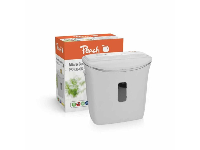Peach PS600-06 je kompaktná skartovačka s vysokým stupňom zabezpečenia P-5, ideálna pre dôverné dokumenty. Vďaka mikrorezu zmení každý papier na častice veľké len 2x14 mm. Naraz skartuje až 5 listov papiera (70 g/m2) alebo kreditné karty. Disponuje 12-litrovým košom, spätným chodom a ochranou proti prehriatiu. Jej pracovný cyklus sú 2 minúty nepretržitej prevádzky. S rozmermi 32,5 x 17 x 32 cm a hmotnosťou 3,5 kg sa zmestí do každej domácnosti či malej kancelárie.