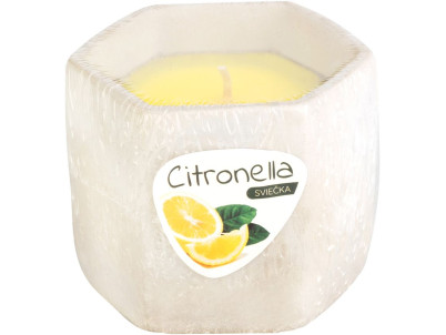 Sviečka Citronella v štýlovej nádobke prevonia Váš domov sviežou citrusovou vôňou. Doba horenia : 12 hodín. Rozmery : 90x75 mm.
