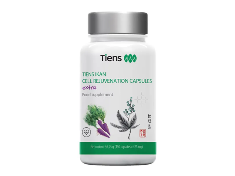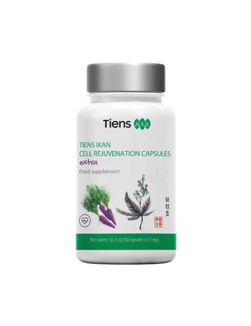 TIENS Ikan Extra je výživový doplnok s obsahom prášku z fialovej mrkvy, výťažkov z listov jiaogulan - ženšenu päťlistého a zeleného čaju, s vitamínom C, ako aj s kvasnicami obohatené chrómom.