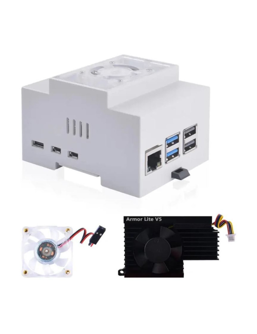 RASPBERRY Pi 5, 52Pi DIN Krabička s chladičom Armor Lite V5 (DSK018) - Odolné ABS puzdro pre Raspberry Pi 5 s montážou na DIN lištu, ideálne pre inteligentnú domácnosť. Poskytuje kompletnú ochranu pred prachom a nečistotami. Obsahuje efektívny chladiaci systém s chladičom Armor Lite V5 a 5V ventilátorom, ktorý zabezpečuje stabilnú prevádzku aj pri vysokej záťaži. Jednoduchá inštalácia bez dodatočných nástrojov. Balenie obsahuje všetko potrebné: puzdro, chladič, ventilátor, montážne prvky a nástr