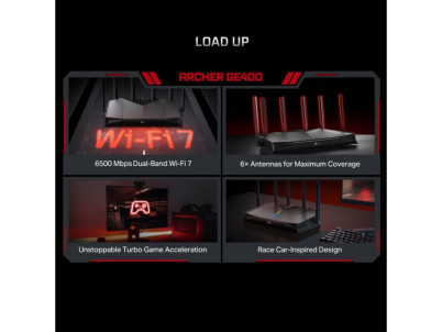 Herný router Archer GE400 s Wi-Fi 7 ponúka rýchlosť až 6,5 Gb/s pre plynulé hranie bez oneskorenia. Je vybavený dvoma 2.5G portami, šiestimi anténami pre maximálne pokrytie a funkciou Turbo Game na akceleráciu hier. Unikátny dizajn dopĺňa RGB podsvietenie a špeciálny herný panel pre monitoring siete v reálnom čase. Bezpečnosť zaisťuje TP-Link HomeShield a vďaka kompatibilite s EasyMesh ľahko vytvoríte jednotnú sieť v celej domácnosti. Ideálna voľba pre náročných hráčov.