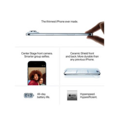 Našlapaný a najtenší iPhone Air so systémom iOS 26, 2× SIM (nanoSIM + eSIM) a podporou 2× eSIM. Odolný IP68, titanový rám, Ceramic Shield na prednej aj zadnej strane. Displej LTPO Super Retina XDR OLED, 6,5" s 120 Hz, 1260×2736, HDR, True Tone, P3. Výkonný procesor Apple A19 Pro (3 nm), 12 GB RAM, 256 GB interná pamäť. Foto/video špička: hlavný foto 48 Mpx s pokročilým spracovaním (Photonic Engine, Deep Fusion, HDR 5), sekundárna 18 Mpx; 4K/60fps, Dolby Vision. Konektivita USB-C, Wi-Fi 6e/7, NFC
