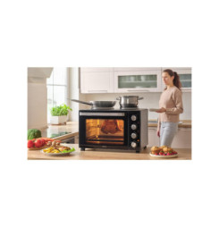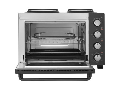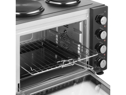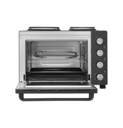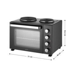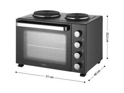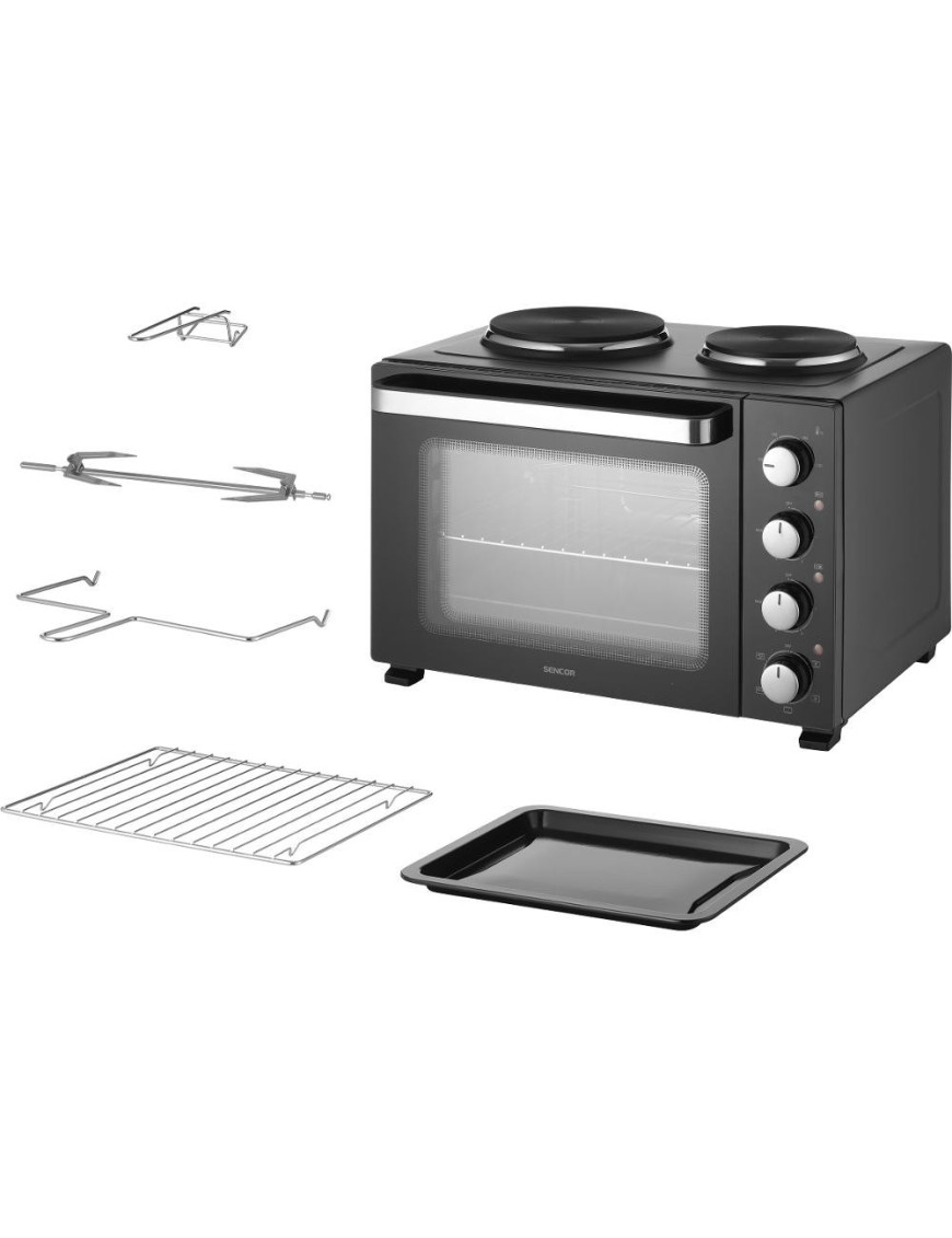 Elektrická rúra s varnými platňami Sencor SEO 3500BK na varenie, pečenie a grilovanie objem 35 l otočný ovládač s 5 voliteľnými programami 4 otočné ovládače pre jednoduché nastavenie integrované vnútorné osvetlenie 3 samostatné kontrolky spotreba energie 3 200 W plynulé n...