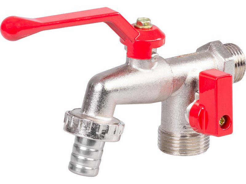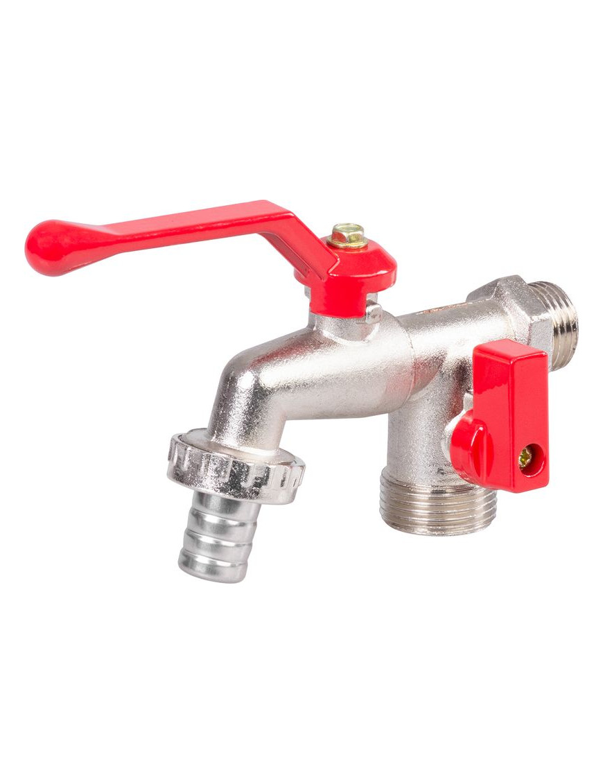 Pákový záhradný ventil Strend Pro s rozmerom na výstupe na hadicu 1/2" a 3/4" vstupom a 3/4" výstupom so samotným uzáverom. Tento ventil je veľmi praktický, keďže umožňuje pripojenie hadice a zároveň z druhého výstupu samostatné púšťanie vody.