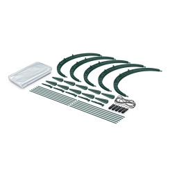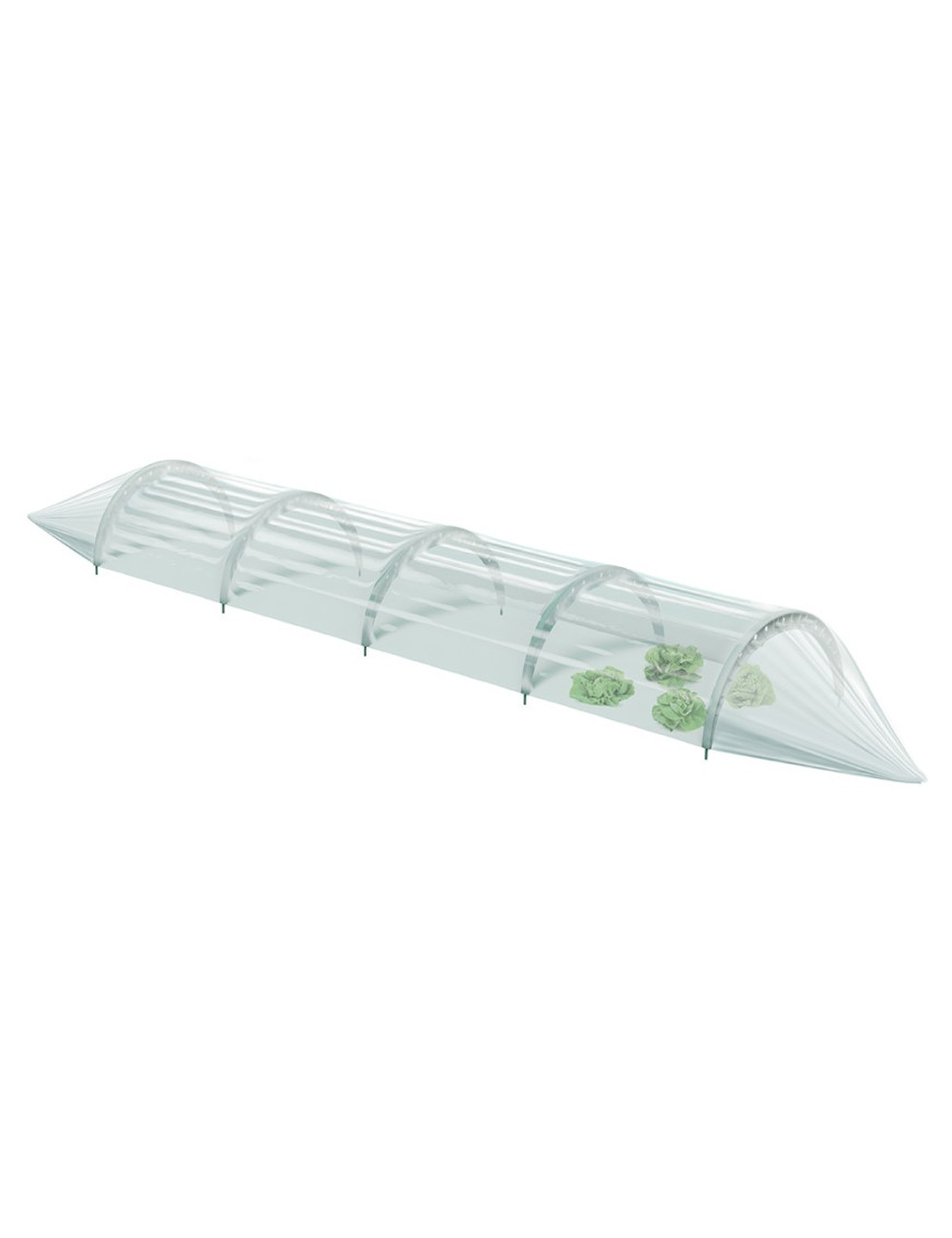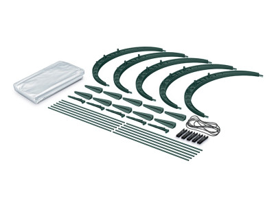 Nízky fóliovník na domáce i poľné pestovanie, priehľadná fólia s hliníkovými očkami na upevnenie k zemi, ochrana rastlín pred dažďom a vetrom, farba zelená.