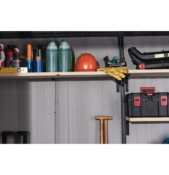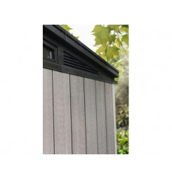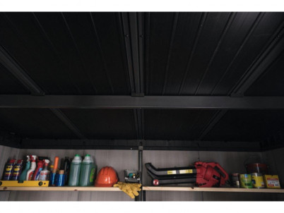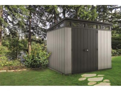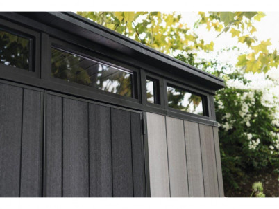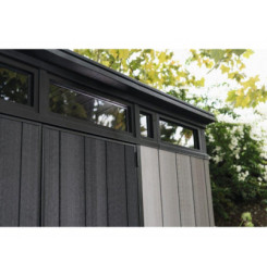 Záhradný domček na skladovanie záhradného i dielenského náradia, športového náčinia a ďalšieho vybavenia, podlahový panel s výdržou až 200 kg/m2, dvojité steny, materiál Duotech, živica a oceľová výstuž, ventilačný systém. Šedý/grafitový.