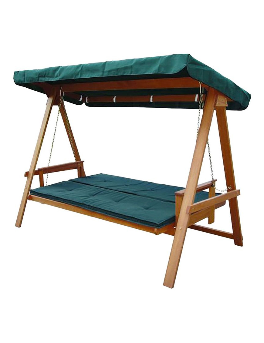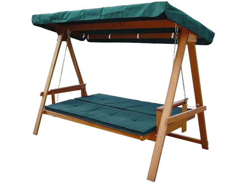 Drevená hojdačka ponúka príjemný oddych a relax priamo vo vašej záhrade. Celá konštrukcia hojdačky je vyrobená z pevného a kvalitného dreva, vďaka čomu ponúka nosnosť až 300 kg. Hojdačka je krytá strechou vyrobenou z materiálu odolného voči vonkajším vplyvom, čím vás chráni pred páliacim slnkom rovnako ako aj pred dažďom. Samotná hojdacia časť je závesná. Na vrchnom konštrukčnom tráme sa nachádzajú dva záchytné háky, na ktoré sa upevnia retiazky hojdačky. Na sedacej časti sa kvôli väčšiemu pohodliu nachádza mäkký sedací aj opierací matrac. Všetky látkové časti hojdačky sú krásnej zelenej farby, čím skvelo ladia k drevu. Rozmery sú 235 x 115 x 180 cm. Hojdačku je potrebné umiestniť na rovný povrch, inak hrozí riziko prevrátenia.