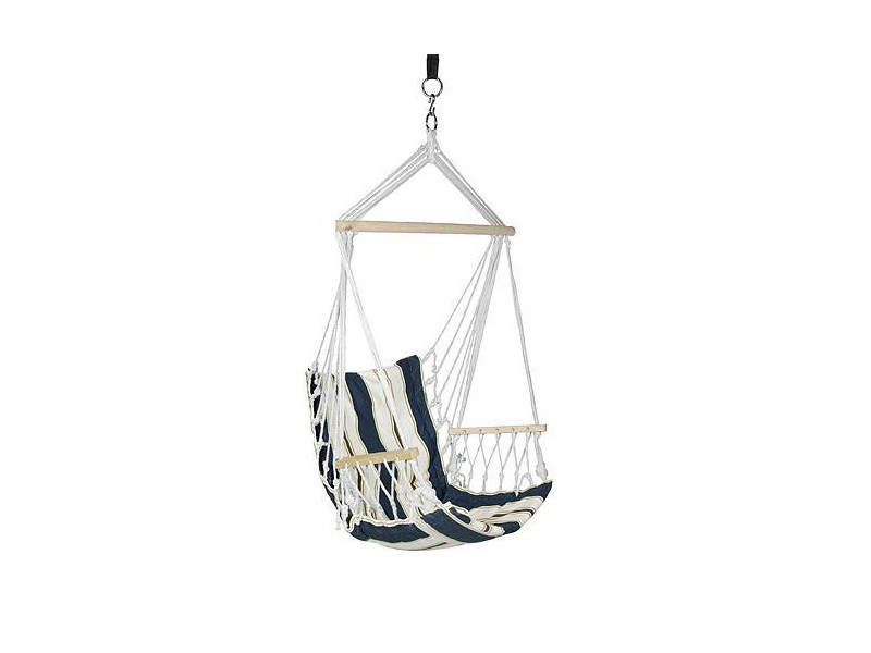 Bavlnené závesné modré kreslo je možné využiť vo vnútorných ale i vonkajších priestoroch. Kreslo je potrebné zavesiť na predom navŕtaný hák. Nosnosť je 150 kg a rozmery kresla sú 100 x 50 cm. Bavlnená sedacia časť je spevnené drevom, pre poskytovanie väčšej opory a pohodlia.