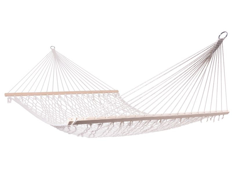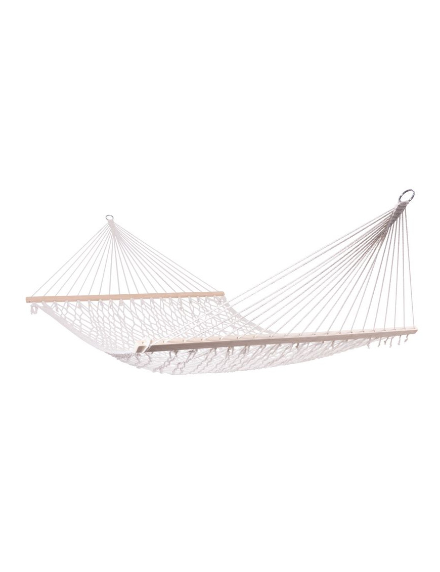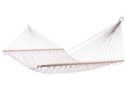 Biela hojdacia sieť je vyrobená z pleteného PE lana. Lano poskytuje dostatočnú pevnosť pre nosnosť až 200 kg. Otvory medzi zapletaným lanom sú dostatočne malé na to, aby ste ich pociťovali, takže sa nemusíte báť, že sa pretrhne. Rozmery siete sú 200 x 150 cm. Na oboch koncoch siete sa nachádza drevená časť pre spevnenie. Sieť je potrebné zavesiť na príslušný stojan pre hojdacie siete.