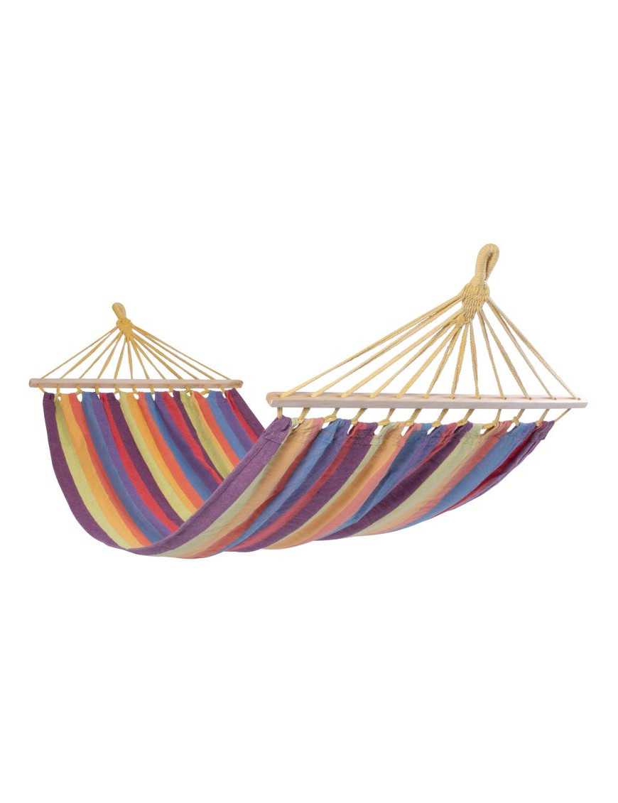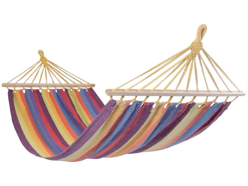 Multifarebná hojdacia sieť je vyrobená z bavlneného plátna. Je skvelým prostriedkom pre oddych. Nosnosť siete je 100 kg a jej rozmery sú 200 x 100 cm. Sieť je spevnená drevenými časťami na oboch koncoch. Sieť je potrebné bezpečne zavesiť na stojan určený pre hojdacie plátna.