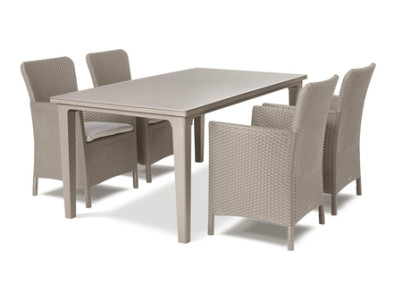 Elegantný obdĺžnikový stôl pre až 6 osôb, imitácia prírodného ratanu, vhodný do interiéru aj exteriéru, odolnosť voči rôznorodým vplyvom - opotrebenie, vlhkosť, hniloba či rozmary počasia, otvor pre slnečník. Vysoká stálosť farby, farba cappuccino.