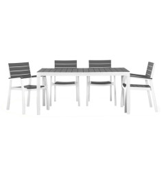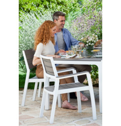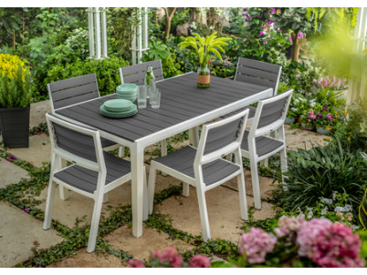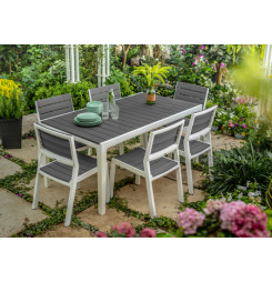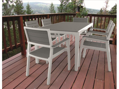 Harmony stôl s bielym rámom a šedými doskami pripomínajúcimi drevo tvoria dokonalý pár s pohodlnými stoličkami rovnakej rady. Nekov. rám je odolný voči hrdzi a je zárukou ľahkej údržby. Konštrukcia z umelej živice. Bielo-šedá farba.