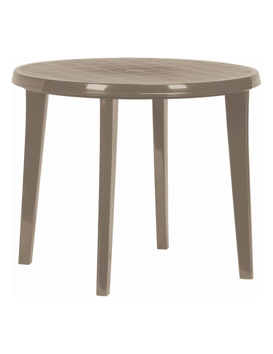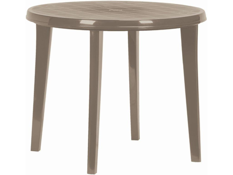 Jednoduchý a praktický kruhový plastový stôl s priemerom 90 cm v elegantnej farbe cappuccino skvele poslúži na každej terase, pod pergolou, na posedenie pri bazéne alebo kdekoľvek inde. Duté nohy možno naplniť pieskom. Otvor pre slnečník.