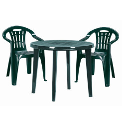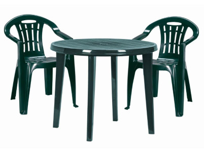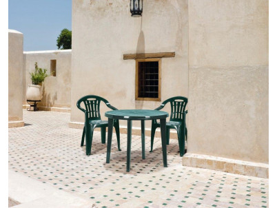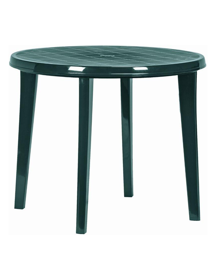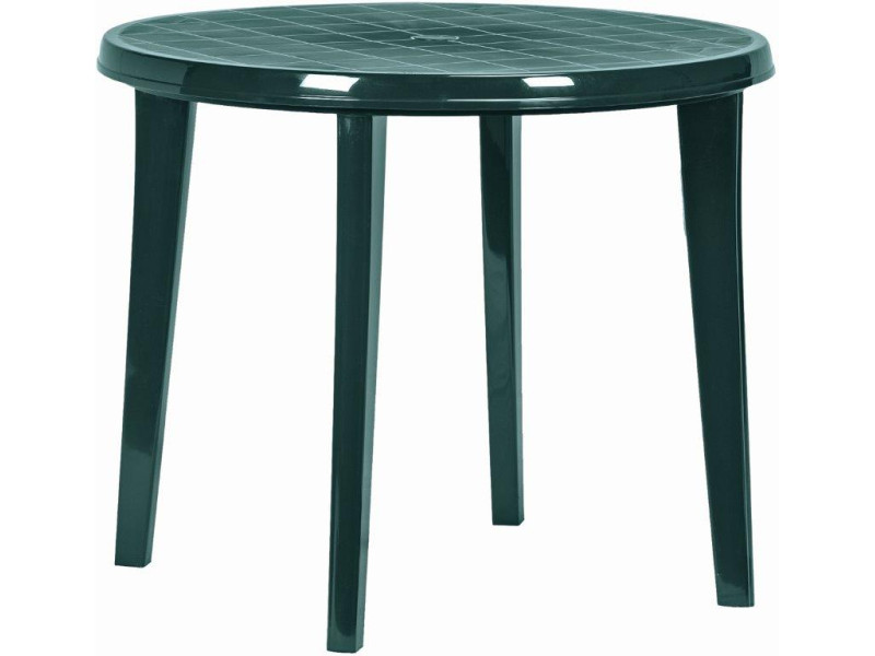Praktický kruhový stôl s priemerom 90 cm v tmavo zelenej farbe, kvalitný plast odolný proti UV žiareniu a poveternostným vplyvom, veľmi ľahká údržba - postačí vám na to mokrá handrička a trochu čistiaceho prostriedku, jednoduchá montáž, otvor na slnečník.