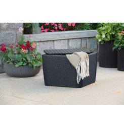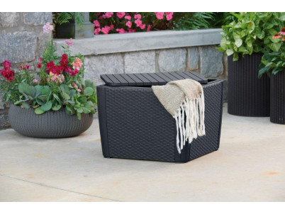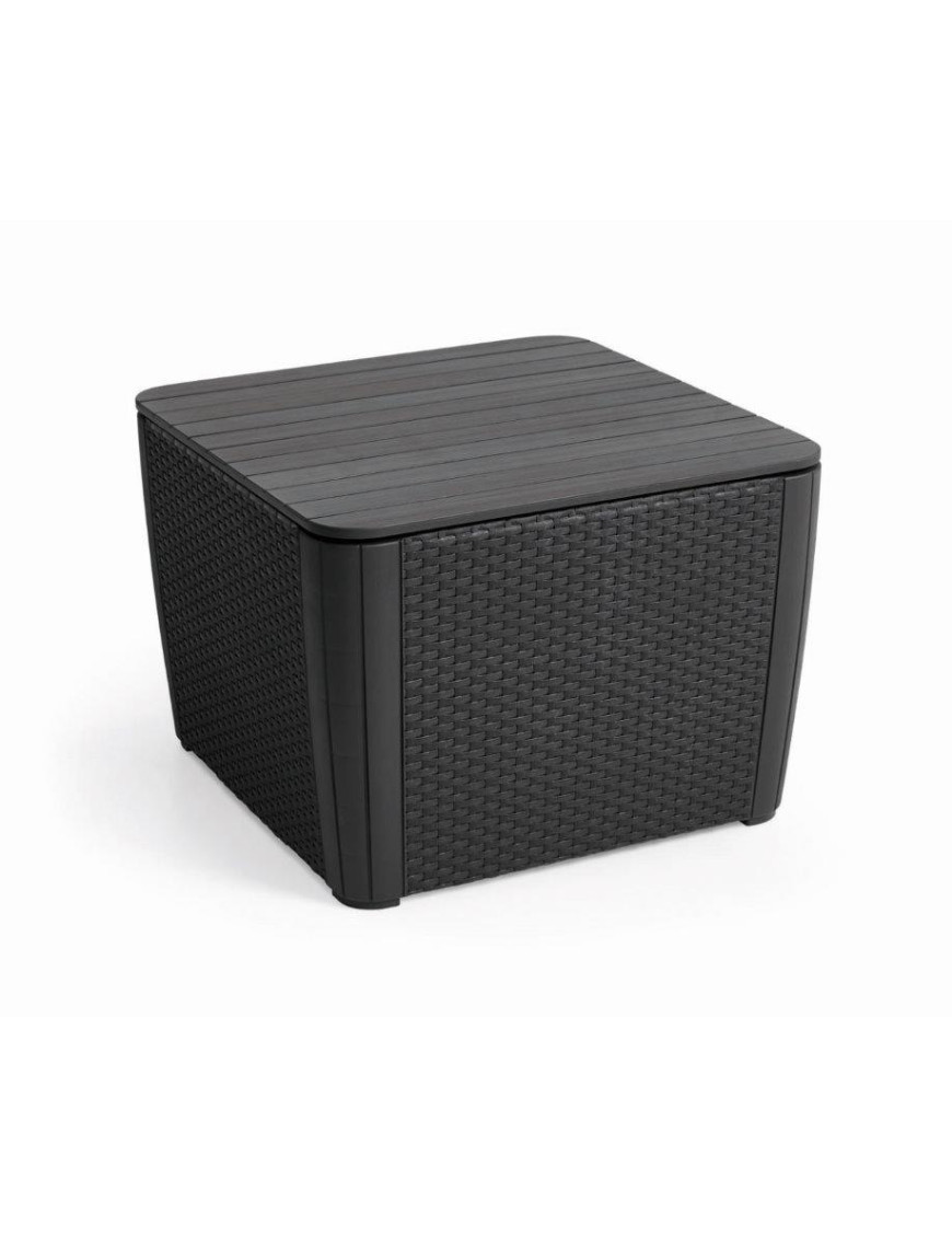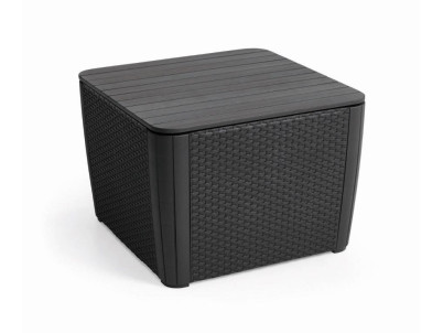 Praktický odkladací stôl s multifunkčným úložným priestorom, ideálny doplnok pre každú záhradu, balkón, pergolu aj terasu, vysoká stálosť farieb aj odolnosť voči mechanickému opotrebovaniu či atmosférickým vplyvom. Imitácia dreva, PP živica. Grafitová.